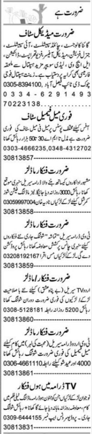 Private Company Faisalabad, faisalabad Punjab Pakistan invites applications from eligible candidates for the post of lhv, doctor, lady sweeper, eye specialist, physiotherapist, child specialist, gynecologist, general physician, medical officer, office staff, model, lady doctor, dietician and actor as per advertisement of April 20, 2022 published in daily Express Newspaper. Candidates with Others, Bachelor, Matric, MBBS, Middle and Intermediate etc. educational background will be preferred.