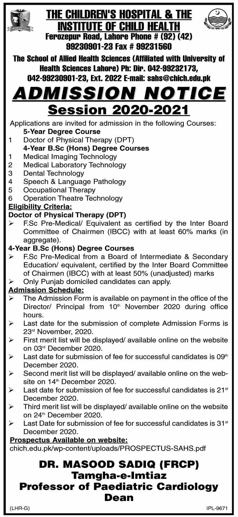 The Childrens Hospital & Institute of Child Health invited applications for admissions in Doctor of Physical Therapy DPT and BSc Hons Degree Courses in Lahore. Read newspaper ad for exact details.
