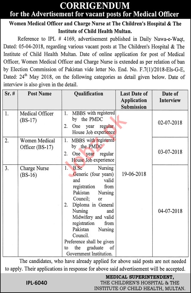 Children Hospital Multan Jobs 2018 For Medical Officers