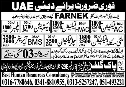 Pak Gulf Tec Ni Test & Training Center jobs advertisement dated about 29 April 2023 in daily Express Newspaper invites application for the vacant post of chiller technician, plumber, bms operator, hvac technician, electrician, ac technician and multi skilled technician in Abu Dhabi, dubai UAE. Preferred Education is B.E, Intermediate, DAE, Bachelor and Matric etc.