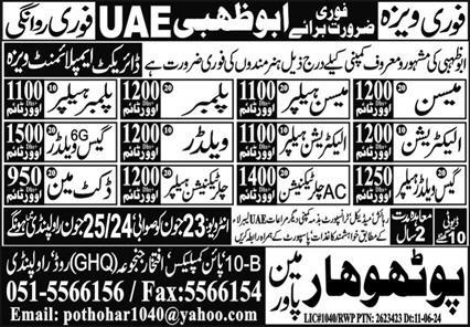 Pothohar Manpower jobs advertisement dated about 21 June 2024 in daily Express Newspaper invites application for the vacant post of 6g welder, electrician helper, electrician, gas welder, plumber helper, mason, chiller technician helper, gas welder helper, welder, ac chiller technician, mason helper, duct man and plumber in Abu Dhabi, sharjah UAE. Preferred Education is Intermediate, Matric and Middle etc.