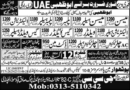 Vacant posts including gas welder helper, plumber, 6g welder, electrician, ac chiller technician, chiller technician helper, duct man, gas welder, mason, mason helper, welder, plumber helper and electrician helper are announced in GCC Techni Test & Training Center Abu Dhabi, sharjah UAE as per 9 August 2024 advertisement in daily Express Newspaper. Candidates with Matric, DAE and Intermediate etc. educational background will be preferred.