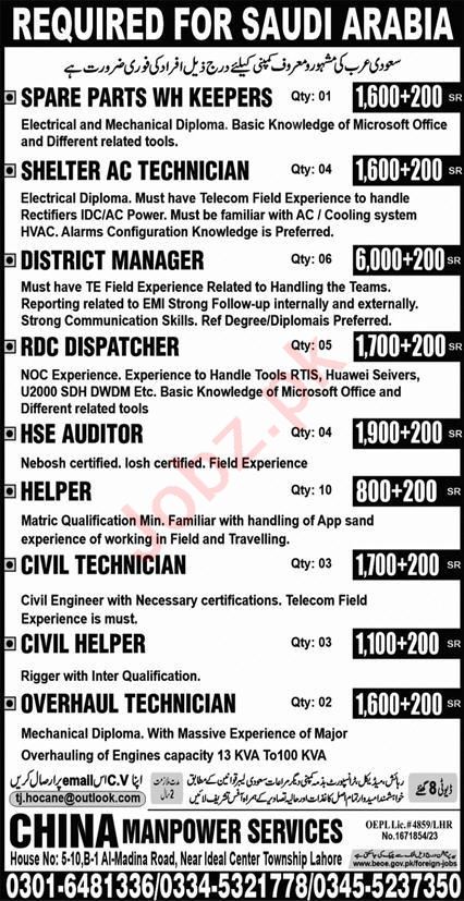 China Manpower Services jobs advertisement dated about 25 June 2023 in daily Express Newspaper invites application for the vacant post of spare parts wh keepers, hse auditor, civil technician, district manager, civil helper, overhaul technician, rdc dispactcher, helper and shelter ac technician in Makkah, madina Saudi Arabia. Candidates with Intermediate, Bachelor, Matric and DAE etc. educational background will be preferred.