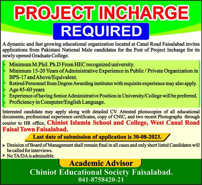 Chiniot Islamia School & College Faisalabad, faisalabad Punjab Pakistan invites applications from eligible candidates for the post of project incharge as per advertisement of August 20, 2023 published in daily Express Newspaper. Candidates with Bachelor, MS and Master etc. educational background will be preferred.