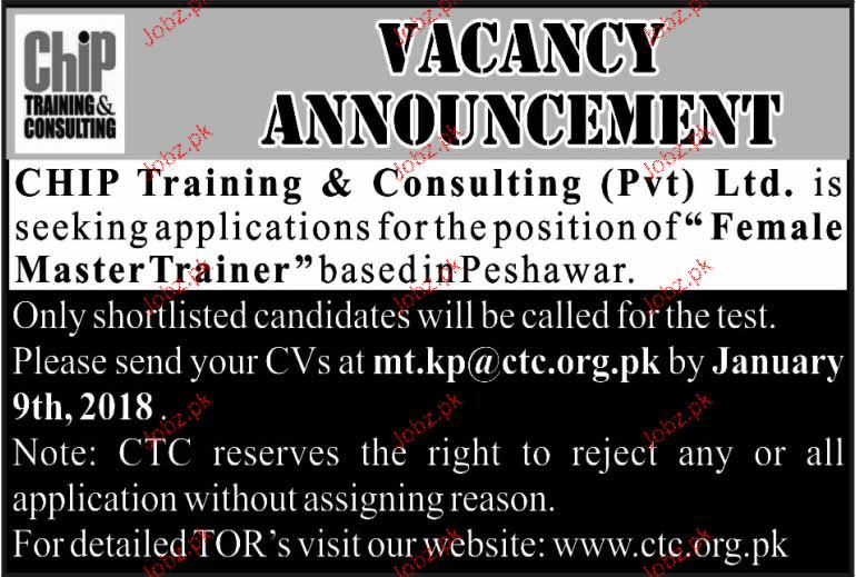 Latest CHIP Training & Consulting Pvt Ltd Teaching Posts Peshawar 2025