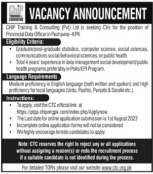 CHIP Training & Consulting Pvt Ltd Peshawar, peshawar Khyber Pakhtunkhwa KPK Pakistan invites applications from eligible candidates for the post of provincial data officer as per advertisement of July 29, 2023 published in daily Mashriq Newspaper. Bachelor, BA and P.G Diploma etc. educational qualification will be preferred.