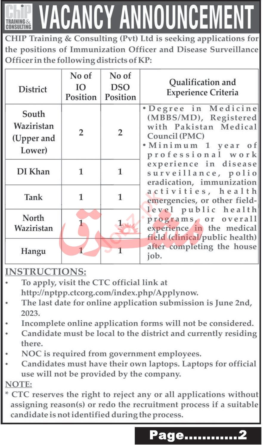 CHIP Training & Consulting Pvt Ltd is looking for candidates for following posts as per job advertisement published in daily Mashriq Newspaper of May 29, 2023 for location Dera Ismail Khan, dera ismail khan Khyber Pakhtunkhwa KPK Pakistan: