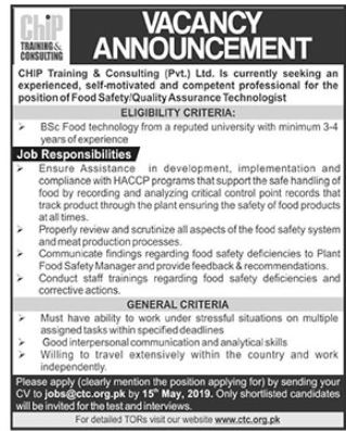 CHIP Training & Consulting Pvt Ltd is seeking application from of experienced, self motivated and hardworking candidates for the posts of Food Safety Officer, Quality Assurance Technologist in Islamabad. Candidates must have at least bachelors degree. Candidates can apply till May 15, 2019.