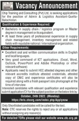 CHIP Training & Consulting Pvt Ltd Quetta, quetta Balochistan Pakistan invites applications from eligible candidates for the post of admin logistics assistant as per advertisement of October 19, 2022 published in daily Jang Newspaper. MS, Bachelor and Master etc. educational qualification will be preferred.