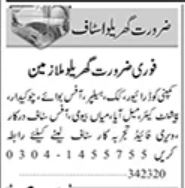 Vacant posts including office boy, chowkidar, office staff, aya, husband wife, cook helper, driver and patient care are announced in House Karachi, karachi Sindh Pakistan as per 4 April 2023 advertisement in daily Dunya Newspaper. Matric, Primary and Middle etc. educational qualification will be preferred.
