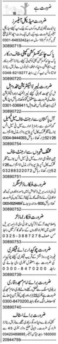 Vacant posts including imam masjid, medical officer, chowkidar, doctor, factory worker, model, call operator, office boy, supervisor, clerk, labor, manager, qari, singer, security officer, electrician and actor are announced in Private Company Lahore, lahore Punjab Pakistan as per 3 September 2024 advertisement in daily Express Newspaper. Persons with BA, Intermediate, Bachelor, MBBS, Middle, Matric and B.com etc. education can apply.