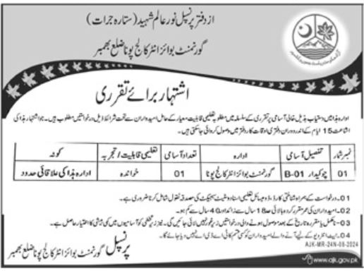 Chowkidar Job At Govt Boys Inter College Bhimber