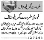 House jobs advertisement dated about 12 July 2024 in daily Dunya Newspaper invites application for the vacant post of patient care, driver, husband wife, office boy, chowkidar, cook and kitchen helper in Lahore, lahore Punjab Pakistan. Preferred Education is Primary, Matric and Middle etc.