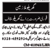 Vacant posts including cook, chowkidar, husband wife, kitchen helper, patient care, driver and office boy are announced in House Islamabad, islamabad Islamabad Pakistan as per 3 June 2025 advertisement in daily Nawaiwaqt Newspaper. Primary, Middle and Matric etc. educational qualification will be preferred.