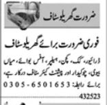 Vacant posts including driver, kitchen helper, chowkidar, cook, husband wife, patient care and office boy are announced in House Multan, multan Punjab Pakistan as per 4 March 2025 advertisement in daily Dunya Newspaper. Preferred Education is Middle, Matric and Primary etc.