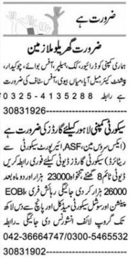 Private Company jobs advertisement dated about 25 October 2022 in daily Express Newspaper invites application for the vacant post of chowkidar, security guard, ltv driver, patient care, cook, husband wife, security staff, office staff, helper, driver, aya and office boy in Lahore, lahore Punjab Pakistan. Candidates with Intermediate, Matric, Bachelor and Middle etc. educational background will be preferred.