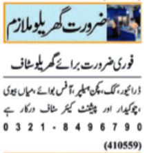 House jobs advertisement dated about 25 March 2025 in daily Nawaiwaqt Newspaper invites application for the vacant post of husband wife, patient care, chowkidar, kitchen helper, cook, driver and office boy in Lahore, lahore Punjab Pakistan. Candidates with Middle, Primary and Matric etc. educational background will be preferred.