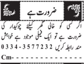 House jobs advertisement dated about 30 July 2025 in daily Jang Newspaper invites application for the vacant post of chowkidar and watchman in Quetta, quetta Balochistan Pakistan. Candidates with Middle and Primary etc. educational background will be preferred.