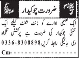 Private School jobs advertisement dated about 21 October 2025 in daily Jang Newspaper invites application for the vacant post of chowkidar and watchman in Quetta, quetta Balochistan Pakistan. Educational qualifications required Primary and Middle etc.