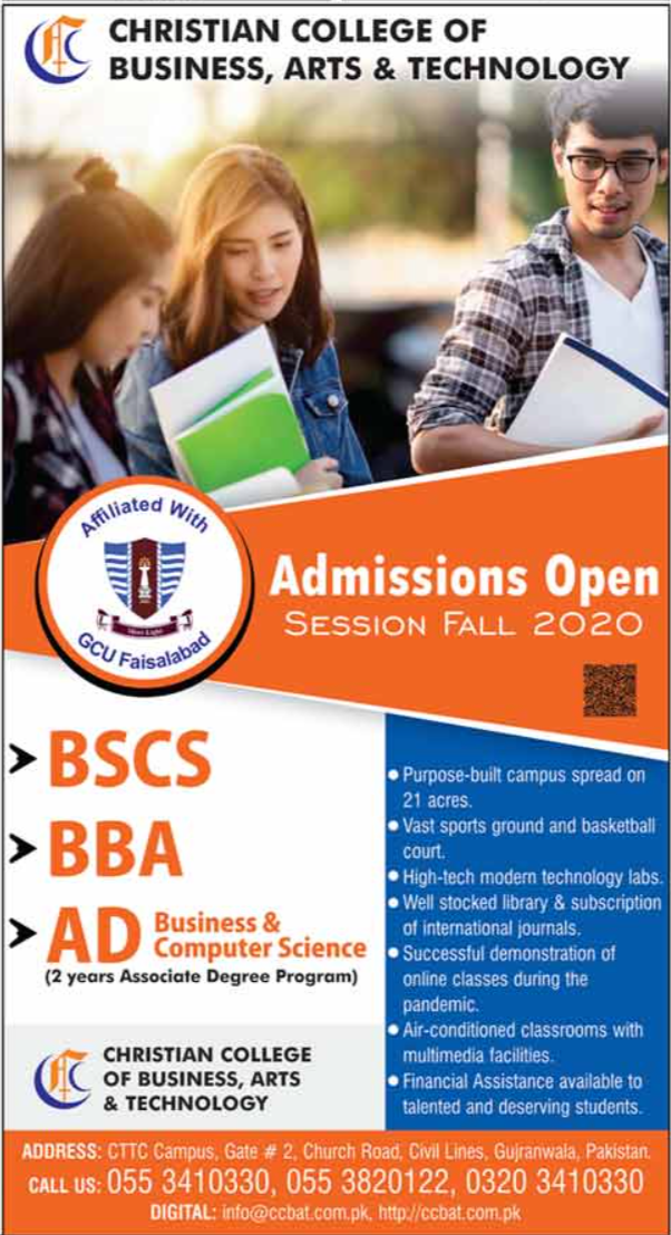 Christian College of Business Arts & Technology affiliated with Government College University GCU Faisalabad has announced admissions in BSCS, BBA & AD Business & Computer Science. Read newspaper ad for exact details.
