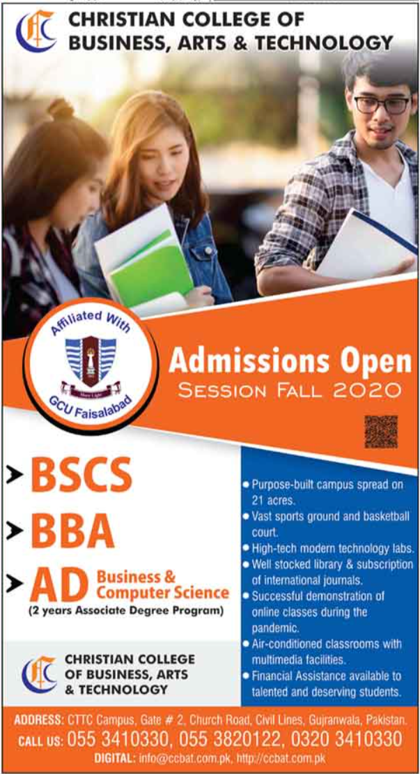Christian College of Business Arts & Technology is offering admissions in BSCS, Bachelor of Business Administration BBA & AD Business & Computer Science Programs in Gujranwala. Read newspaper ad for exact details.