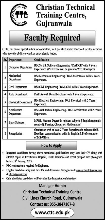 Christian Technical Training Centre CTTC is looking for candidates for following posts as per job advertisement published in daily Express Newspaper of January 12, 2023 for location Gujranwala, gujranwala Punjab Pakistan: