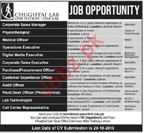 Vacancies in Chughtai Laboratory Advertisement October 2019