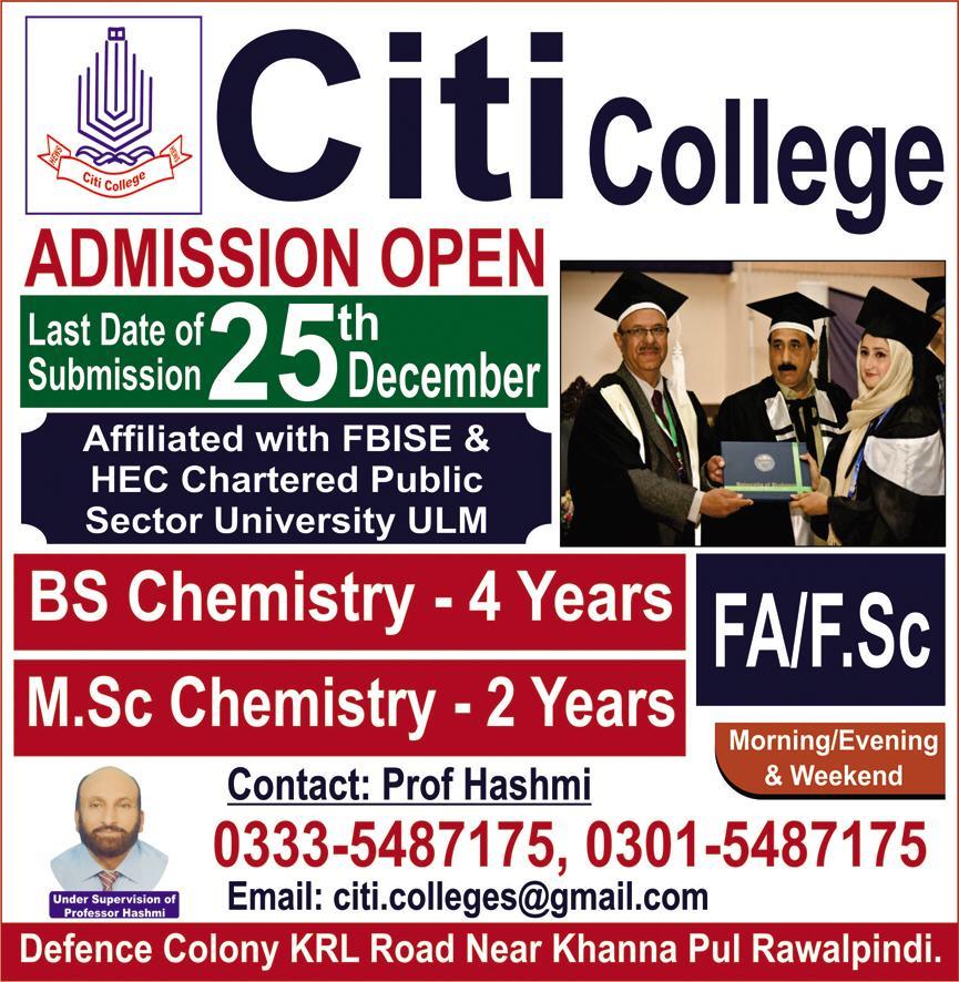 Citi College affiliated with FBISE & HEC Chartered Public Sector University ULM invites applications for admissions in BS Chemistry & MSc Chemistry in Islamabad. Read newspaper ad for exact details.