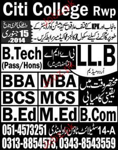 Citi College Rawalpindi Admission in BCom, BBA , MCS and LLB in Rawalpindi Read newspaper ad for exact details.