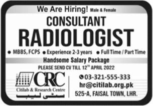 Citi Lab & Research Center invites applications for job positions advertised in daily Jang dated 10 April 2022 for following vacancies in Lahore, lahore Punjab Pakistan.