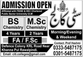 City College affiliated with Federal Board of Intermediate & Secondary Education FBISE & HEC Chartered Public Sector University ULM is offering admissions in BS Chemistry & MSc Chemistry in Rawalpindi. Read newspaper ad for exact details.