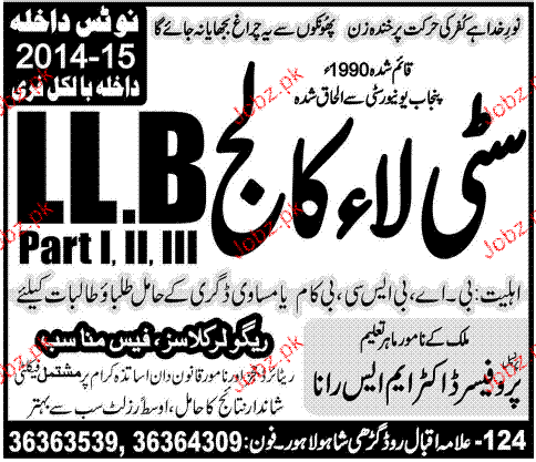 City Law College Admission in LLB in Lahore. Read newspaper ad for exact details.