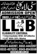 City Law college Rawalakot Azad Kashmir is offering admissions in the course of LLB five year program. The students should have 45% marks in intermediate with LAT 50% marks. Read newspaper ad for exact details.
