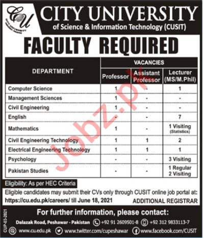 Vacancies in City University of Science & Information Technology CUSIT Advertisement June 2021