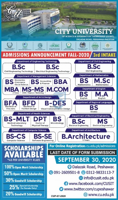 City University of Science & Information Technology CUSIT is offering admissions for BSc, BS, BBA, BFA, BFD, BDES, BS MLT, DPT, BSCS, BSSE degree programs. Read newspaper ad for exact details.