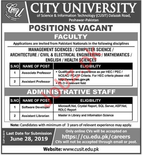Vacancies in City University of Science & Information Technology CUSIT Advertisement June 2019