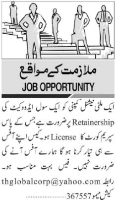 Vacant posts including civil advocate and advocate are announced in Multinational Company Karachi, karachi Sindh Pakistan as per 4 April 2023 advertisement in daily Jang Newspaper. Preferred Education is Bachelor etc.