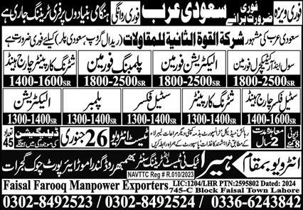 Vacant posts including steel fixer, architectural foreman, steel fixer chargehand, plumbing foreman, civil foreman, shuttering carpenter, electrician foreman, shuttering carpenter chargehand, electrician and plumber are announced in Heera Tech Ni Test & Training Center Riyadh, tabuk Saudi Arabia as per 16 January 2025 advertisement in daily Express Newspaper. Educational qualifications required BA, DAE, Matric, Bachelor and Intermediate etc.
