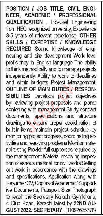 Engineering Company is looking for candidates for following posts as per job advertisement published in daily Dawn Newspaper of August 16, 2022 for location Karachi, karachi Sindh Pakistan: