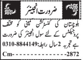 Construction Company jobs advertisement dated about 5 March 2022 in daily Jang Newspaper invites application for the vacant post of engineer and civil engineer in Quetta, quetta Balochistan Pakistan. Educational qualifications required Intermediate and Bachelor etc.