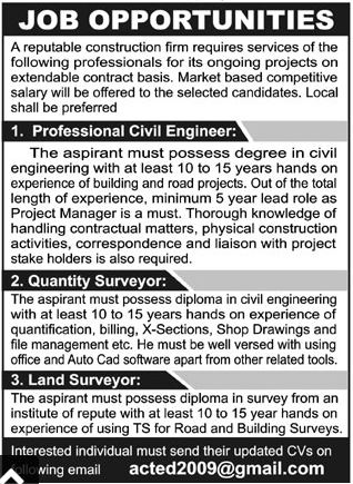Construction Company jobs advertisement dated about 1 May 2025 in daily Aaj Newspaper invites application for the vacant post of quantity surveyor and civil engineer in Peshawar, peshawar Khyber Pakhtunkhwa KPK Pakistan. Educational qualifications required Others, DAE, B.E, Intermediate and Bachelor etc.