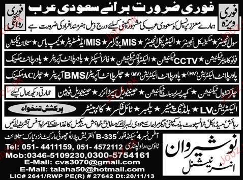 Civil Engineers, Electrical Engineers, MIS Administrators, Power Plant Electricians, Chiller Plant Operators, AC Mechanics and Building Painters are required in Saudi Arabia