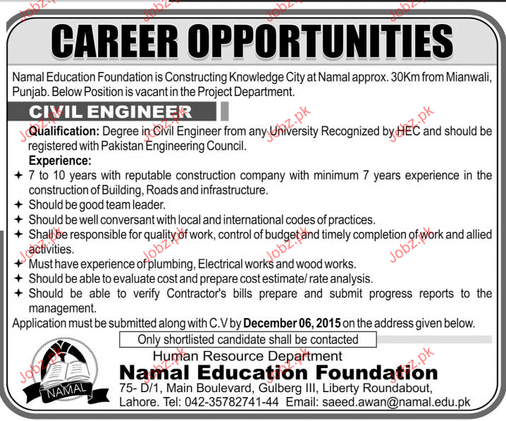 Civil Engineers are required in NAMAL Education Foundation in Lahore.