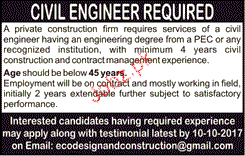 Civil Engineers are required in A Private Construction Firm in Lahore. Qualified and Experienced Candidate Send their CV Along with All necessary Documents.