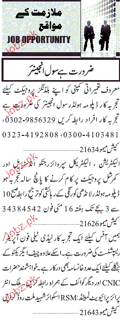 Civil Engineers, Receptionist, Telephone Operator Wanted