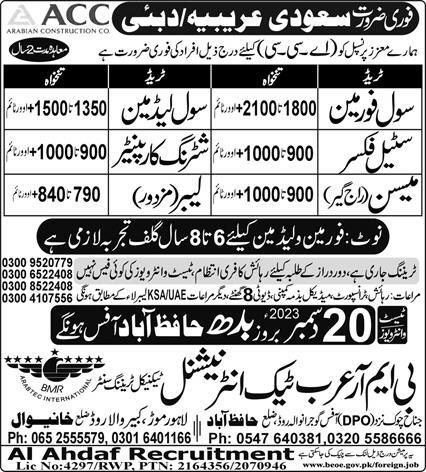 Vacant posts including civil leadman, shuttering carpenter, mason, civil foreman, labor and steel fixer are announced in Al Ahdaf Recruitment Overseas Employment Promoters Riyadh, riyadh and dubai Saudi Arabia as per 20 December 2023 advertisement in daily Express Newspaper. Educational qualifications required Matric and Middle etc.