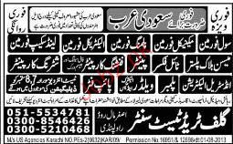 Civil Foreman, Mechanical Foreman, Mason, Tile Fixers, Finishing Carpenters, Industrial Electricians and Plumbers are required in Saudi Arabia