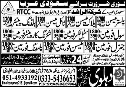Dahlawi Manpower Recruiting Riyadh, madina Saudi Arabia invites applications from eligible candidates for the post of electrical foreman, plaster mason, block mason, steel fixer foreman, architecture finishing foreman, mason foreman, general foreman, civil foreman, tile mason, building painter, shuttering carpenter foreman and plumbing foreman as per advertisement of January 20, 2024 published in daily Express Newspaper. Persons with Matric, DAE, Middle, Bachelor and Intermediate etc. education can apply.