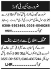 Private Company jobs advertisement dated about 3 January 2024 in daily Khabrain Newspaper invites application for the vacant post of female office staff, civil guard, office staff, fauji guard and security guard in Lahore, islamabad Punjab Pakistan. Middle, Bachelor, Intermediate, Matric and BA etc. educational qualification will be preferred.