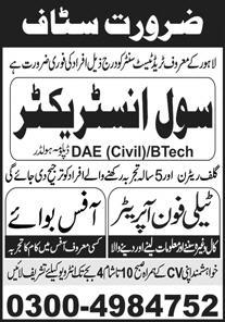 Civil Instructor & Telephone Operator Jobs 2022 in Lahore